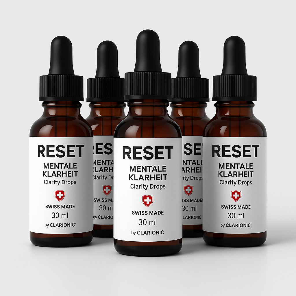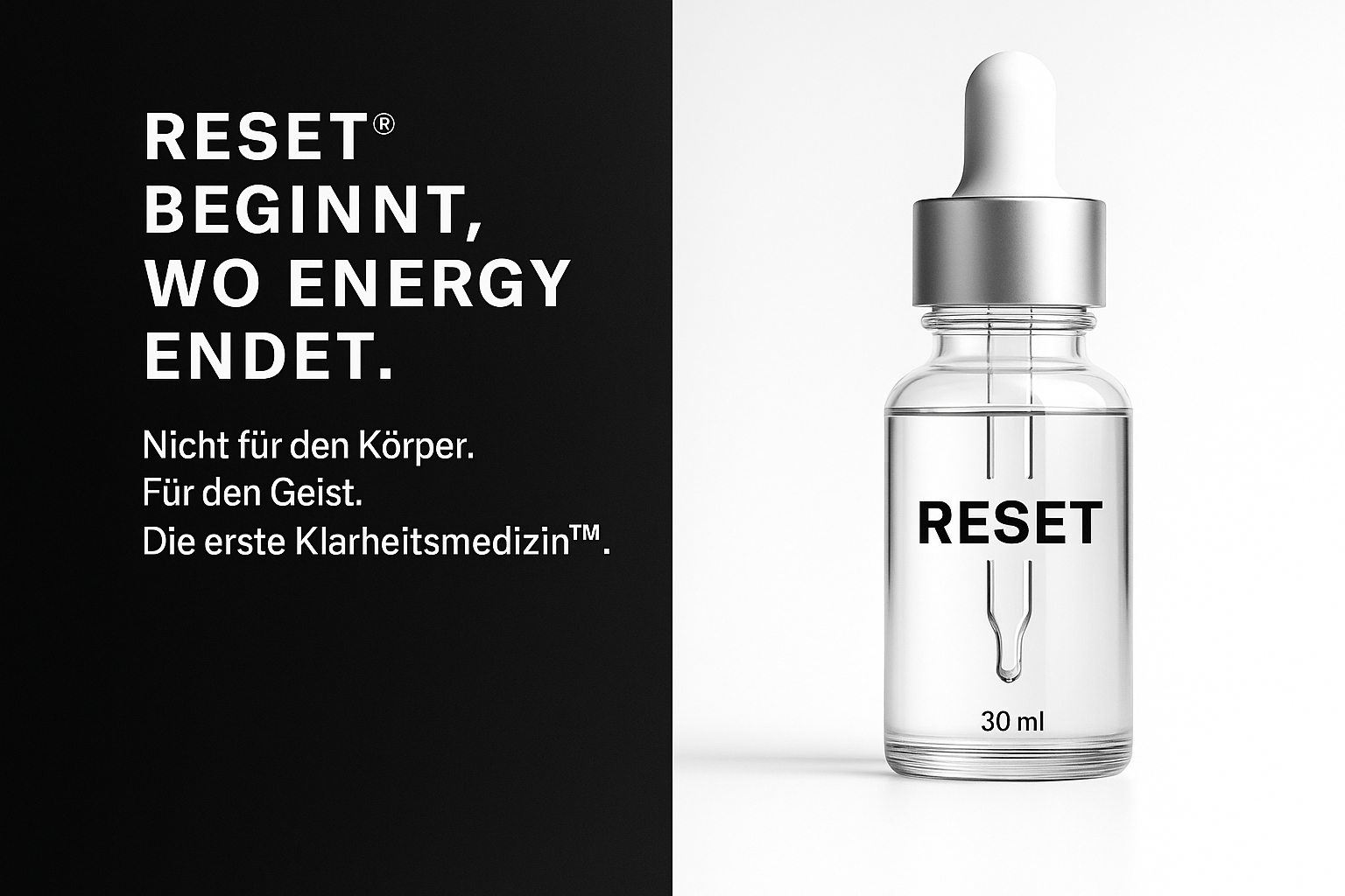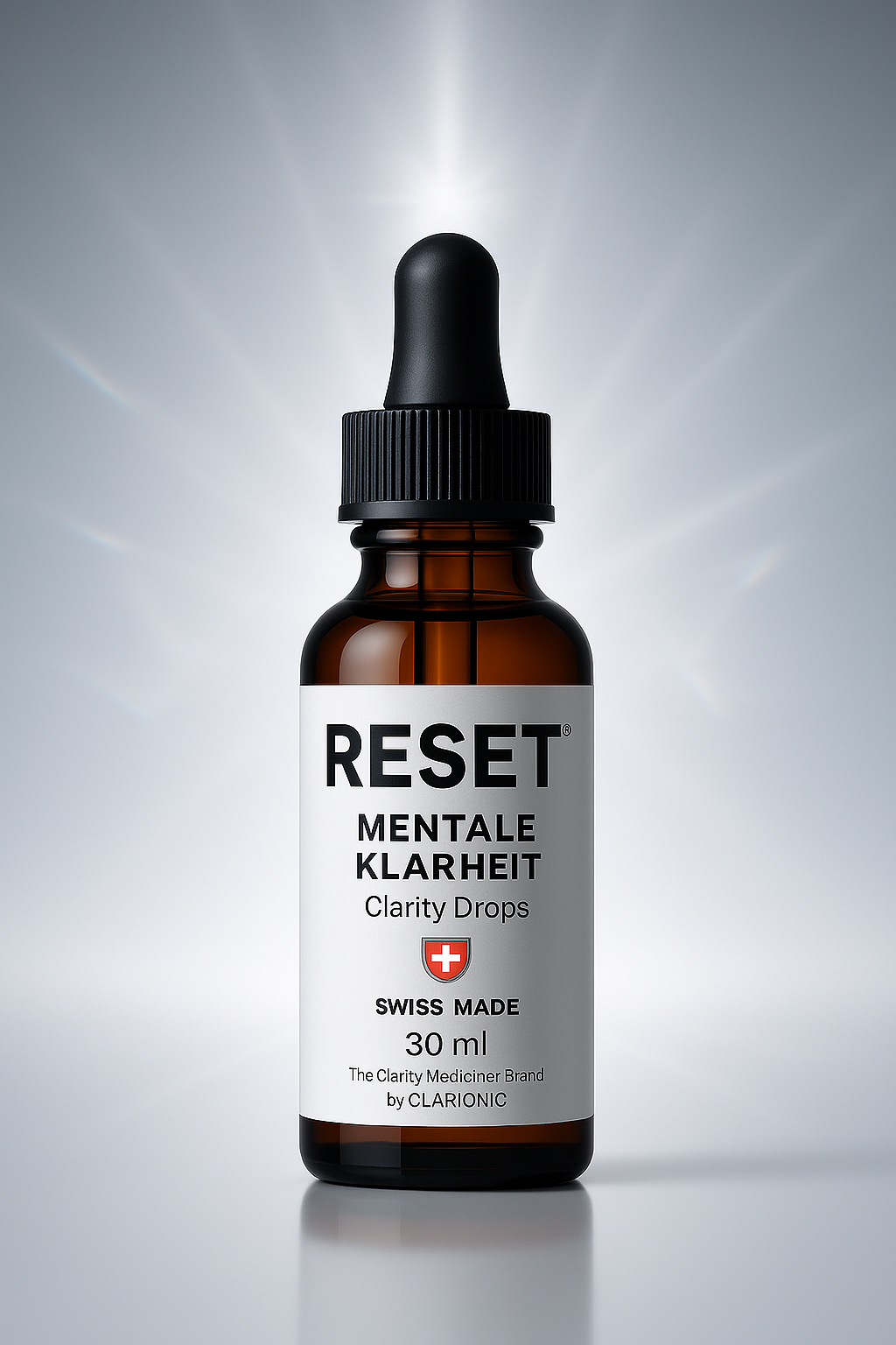 RESET® ist da: die erste Klarheits-Formel in Tropfen. Swiss Made, vegan, spürbar in Minuten. Kein Koffein. Kein Crash. RESET® eröffnet die Kategorie Klarheitsmedizin™.