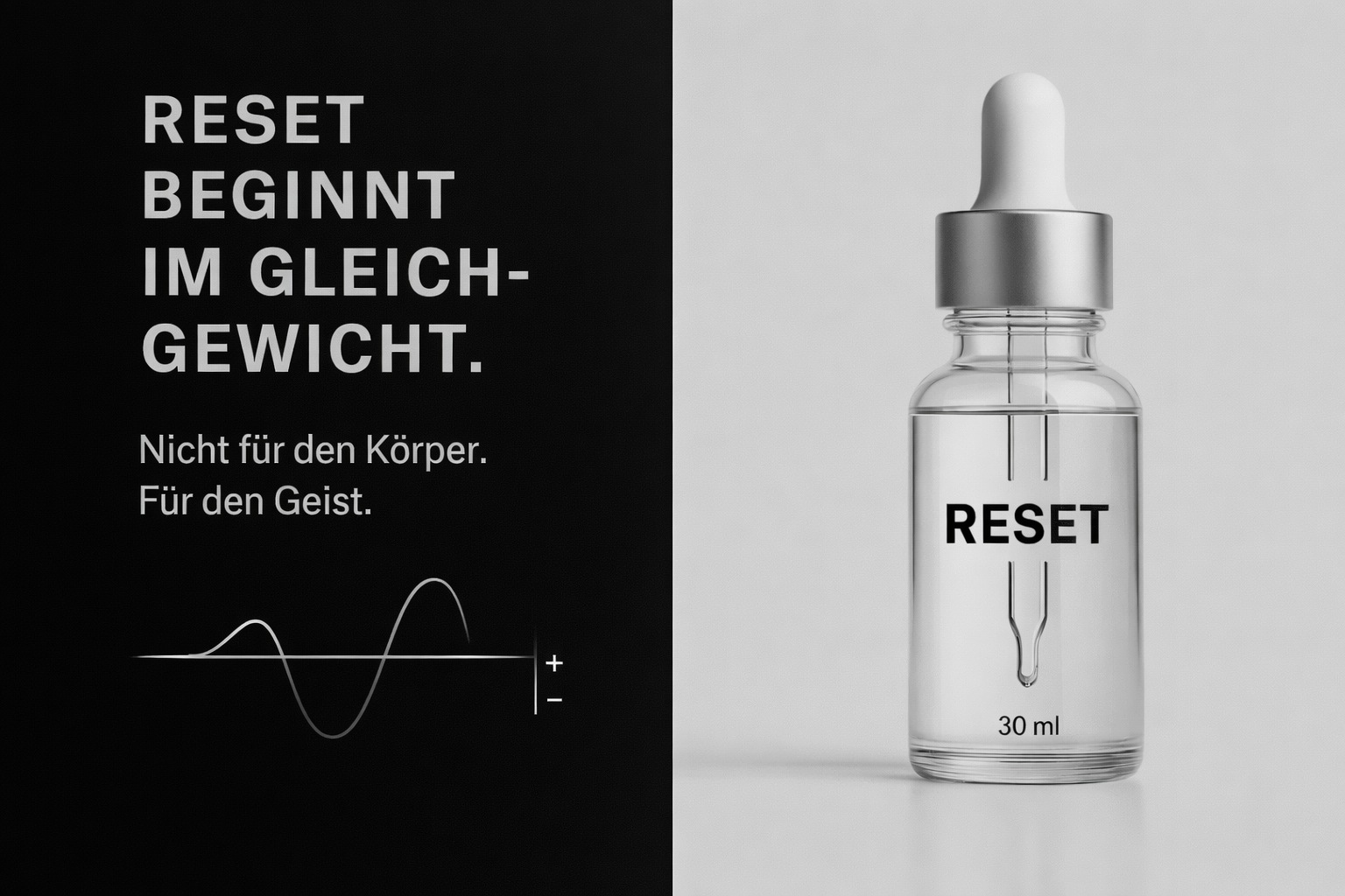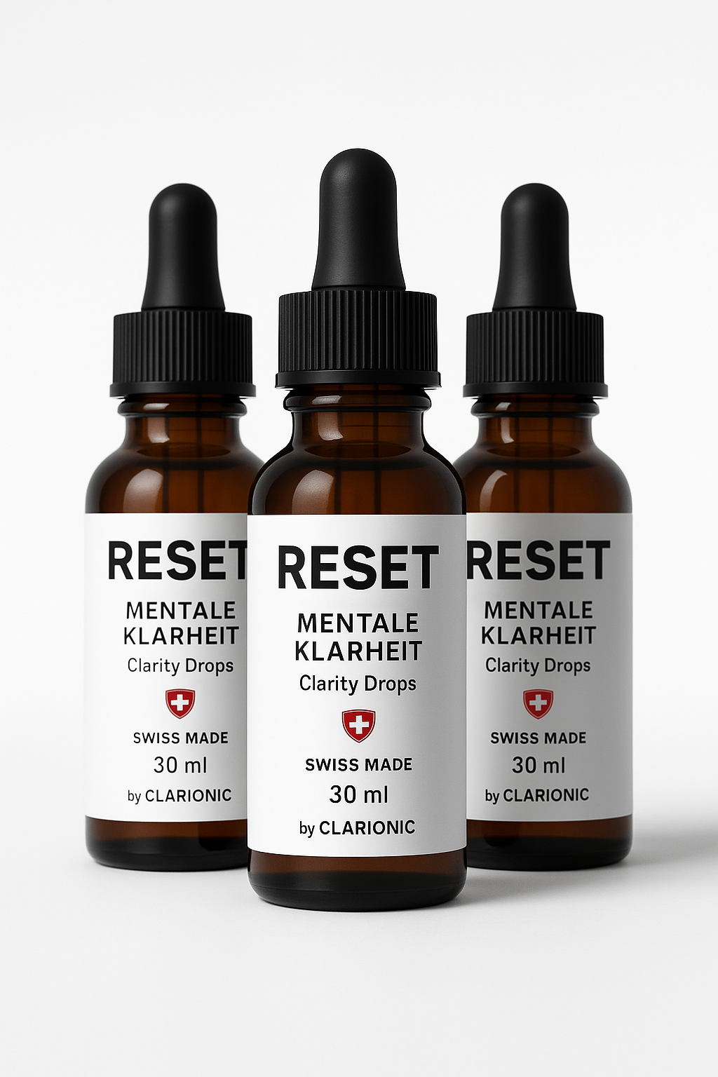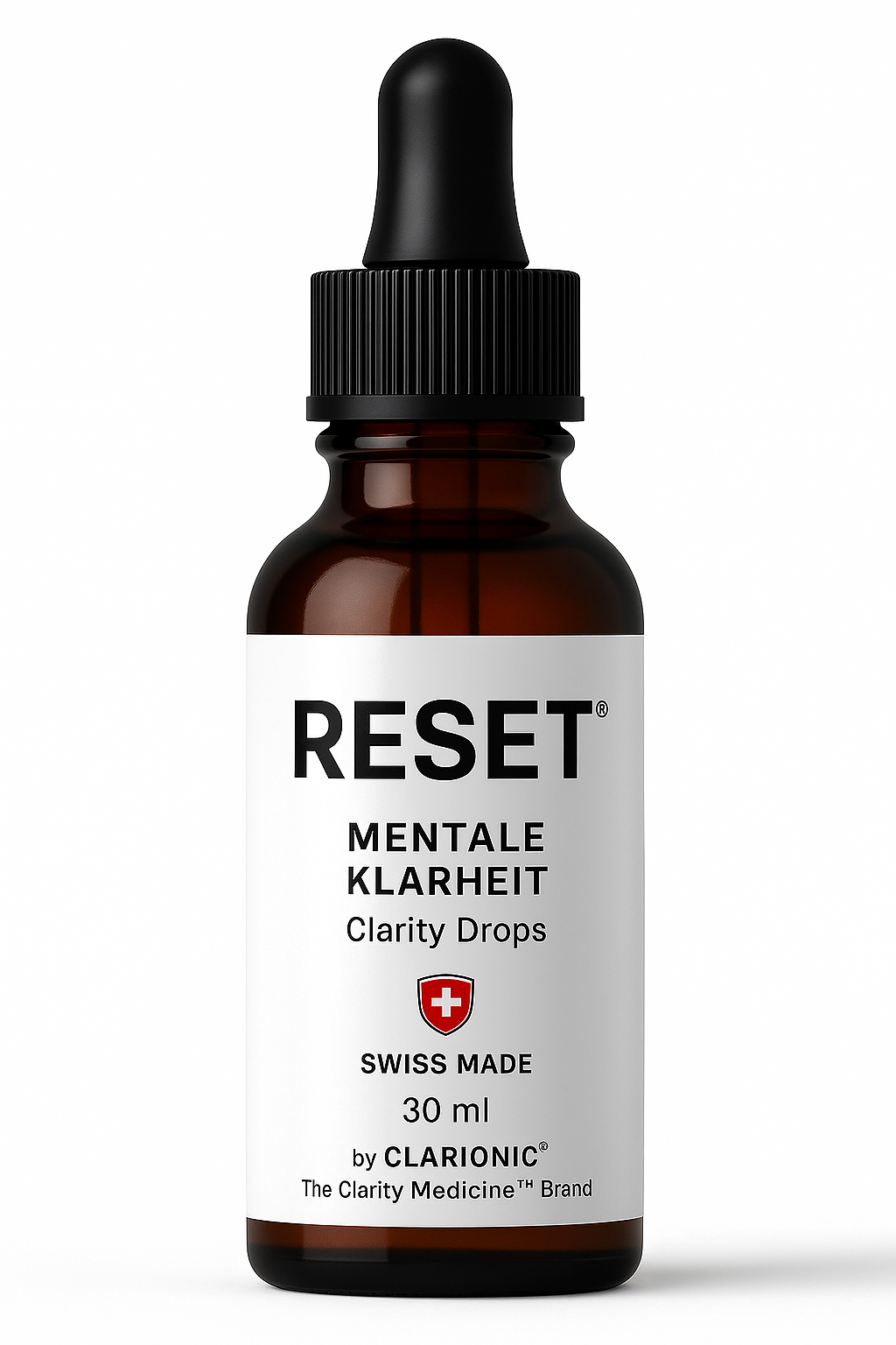RESET® ist da: die erste Klarheits-Formel in Tropfen. Swiss Made, vegan, spürbar in Minuten. Kein Koffein. Kein Crash. RESET® eröffnet die Kategorie Klarheitsmedizin™.
